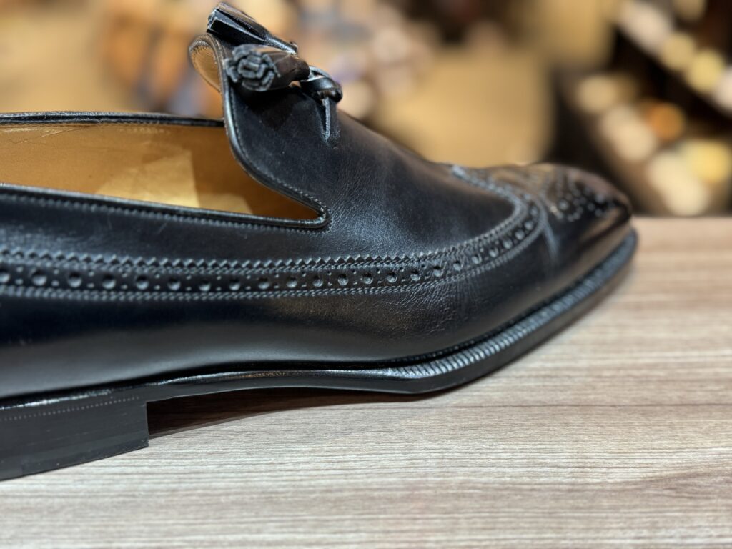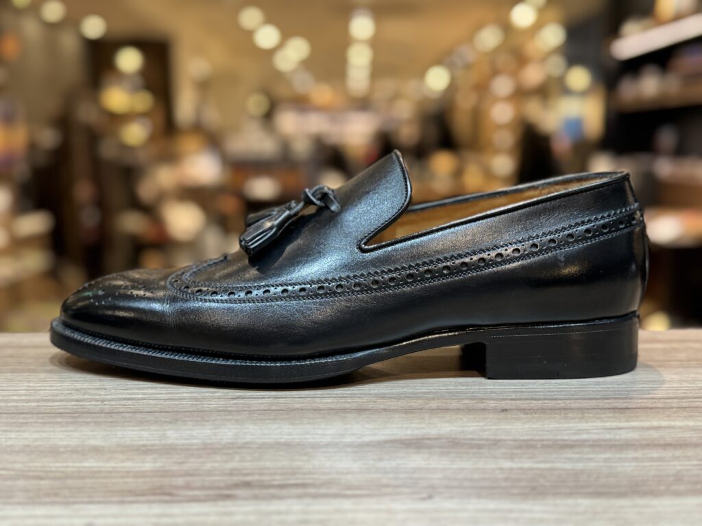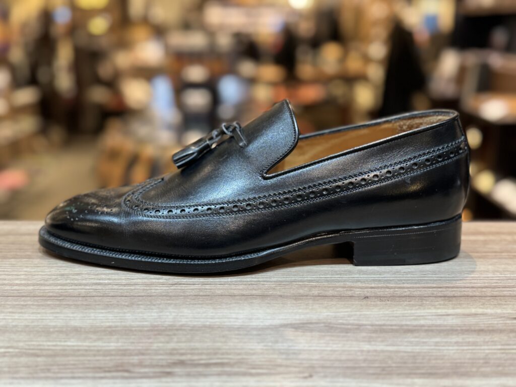 同ブランドのタッセルローファーは、張り出しのあるコバとロングウィングデザインが特徴的で、シンプルながらもどこか職人の息づかいを感じる一足です。