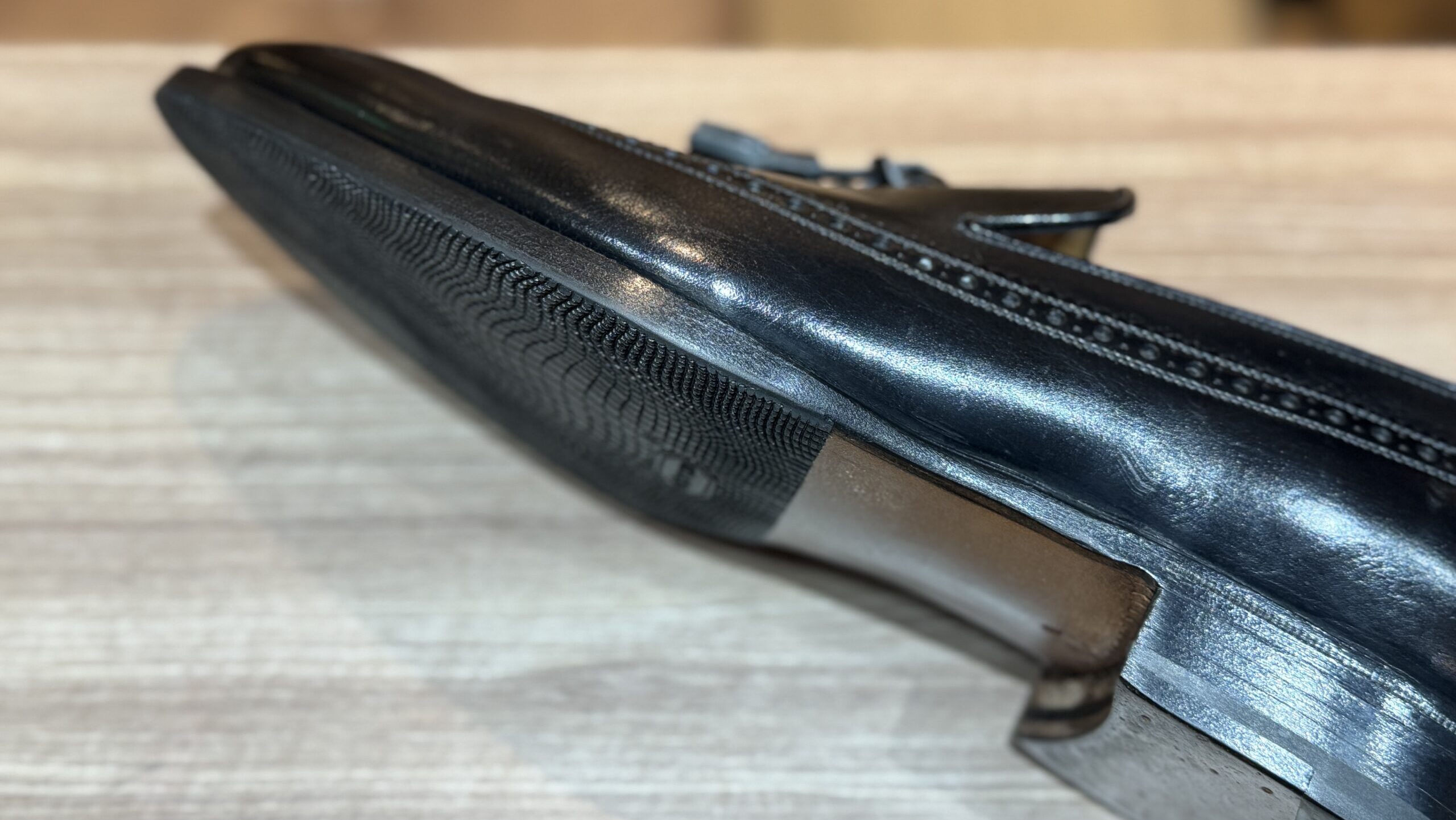 お預かりした一足は、まだ深く履き込まれてはいないものの、つま先の摩耗が気になり始める段階で対策しておきたいというご相談でした。